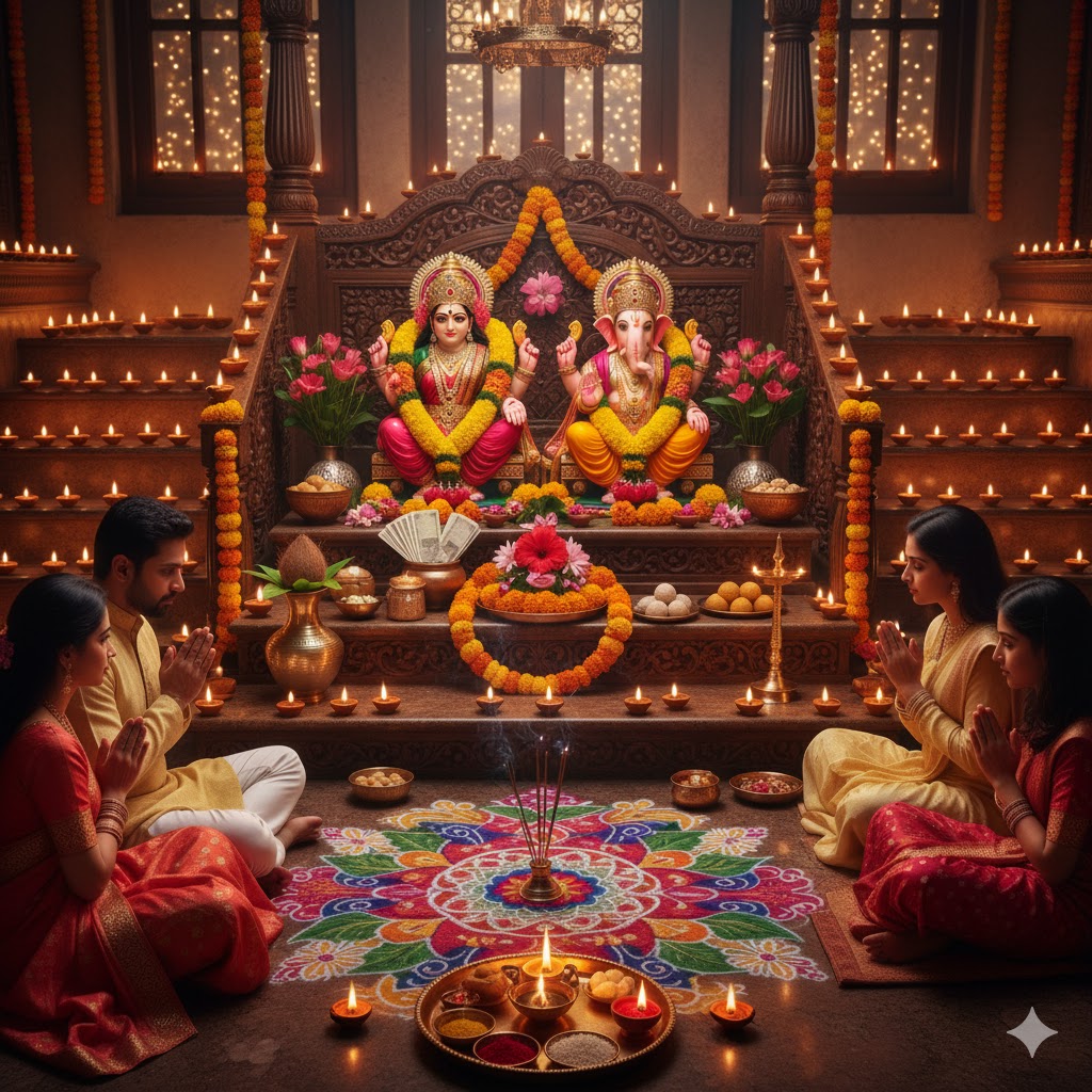 The main puja involves worshipping Goddess Lakshmi (wealth), Lord Ganesha (wisdom and obstacle remover), and Goddess Saraswati (knowledge).It marks the beginning of the new financial year for many business communities.Homes are cleaned and decorated to welcome Lakshmi, who is believed to visit only clean and well-lit homes.
