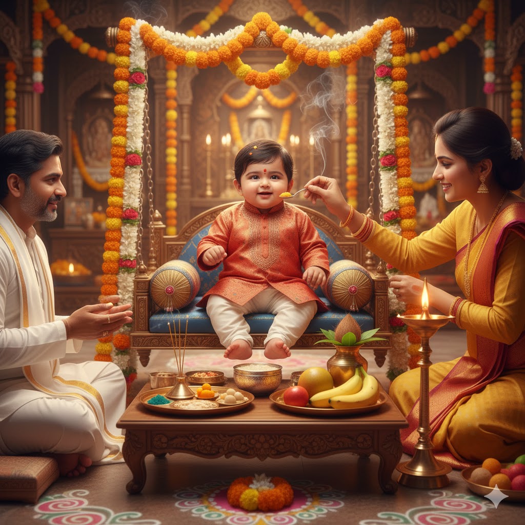 Believed that a name influences the child’s destiny and personality.Performed to seek blessings from deities for the child’s health, happiness, and prosperity.Aligns the child’s life with positive cosmic vibrations through Vedic rituals