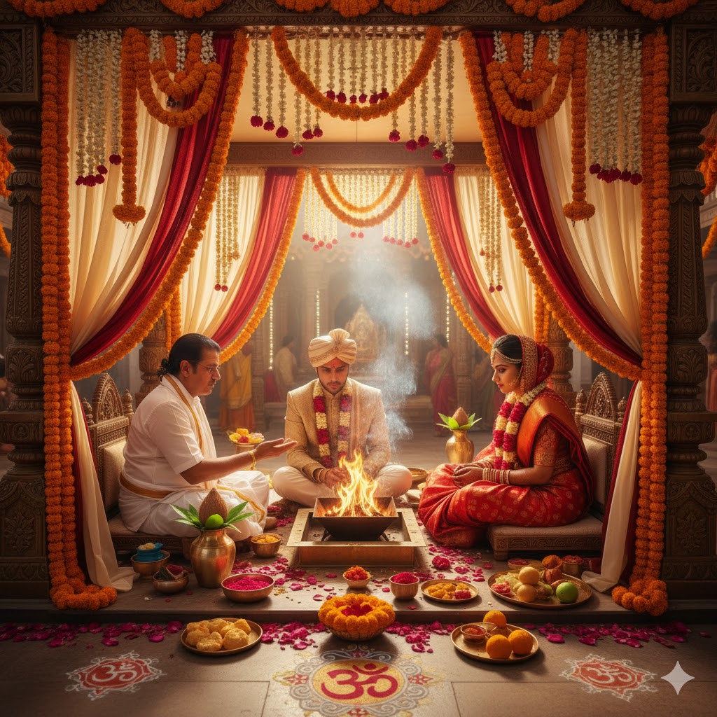 Symbolizes the sacred union of two souls.Aligns the couple’s journey with dharma and karma.Invokes deities like Lord Vishnu, Goddess Lakshmi, and Lord Ganesha.Ensures love, prosperity, and protection from negativity.